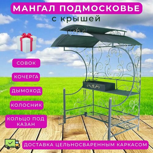 Мангал "Подмосковье" с крышей и жаровней для дачи с подставкой под казан, кованый уличный навес для отдыха на природе из стали 3 мм, стационарный, высокий, каркасный