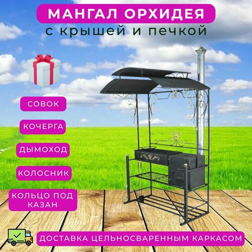 Мангал "Орхидея" с крышей, жаровней и печью под казан c дымоходом, для шашлыка и плова на даче, кованый уличный навес для отдыха на природе из стали 3 мм, стационарный, высокий, большой, каркасныйСаженец роза плетистая Лилиана