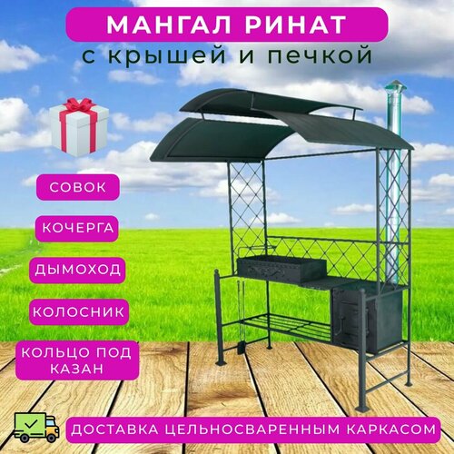 Мангал "Ринат" с крышей, жаровней и печью под казан c дымоходом, для шашлыка и плова на даче, кованый уличный навес для отдыха на природе из стали 3 мм, стационарный, высокий, большой, каркасный~PDXСемена Кресс-салат "Забава" 1 г (1шт.)