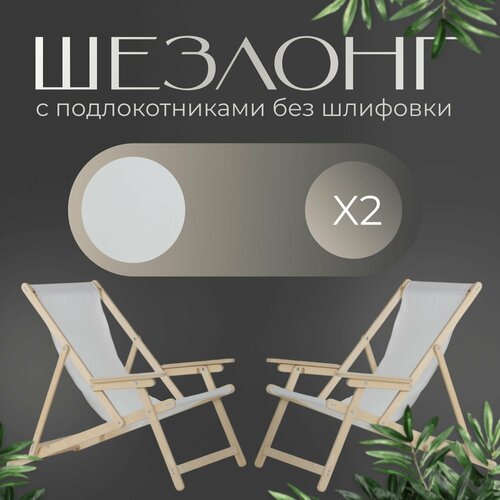 Кресло-шезлонг с подлокотниками для дома, для дачи, на пляж и пикник складной с белой тканью без шлифовки, комплект 2 шт