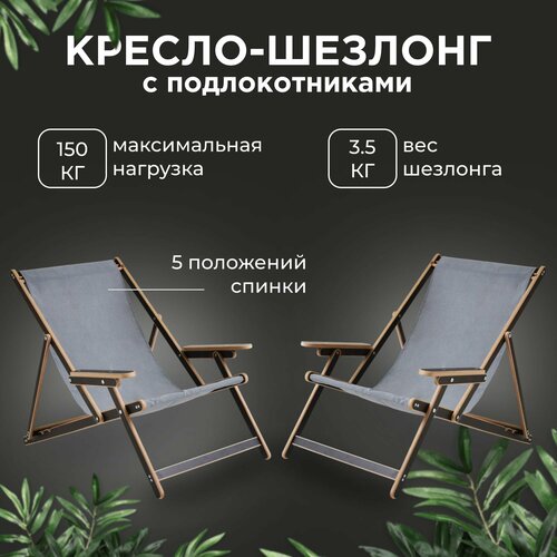 Кресло-шезлонг с подлокотниками для дома, для дачи, на пляж и пикник складной с серой тканью без шлифовки, комплект 2 шт
