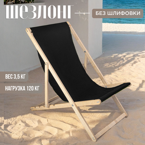 Кресло-шезлонг для дома, для дачи, на пляж и на и пикник складной с черной тканью без шлифовки