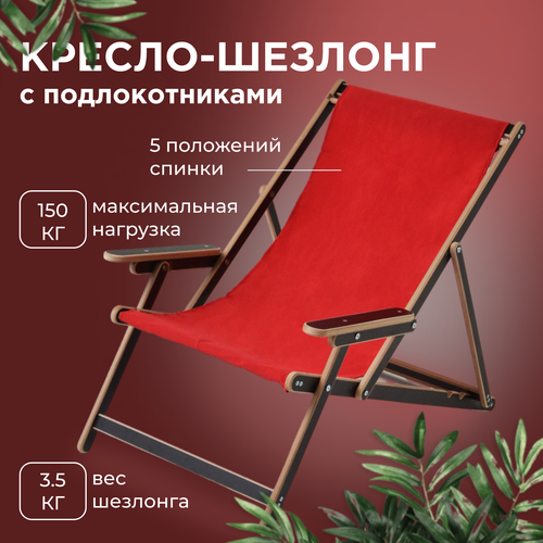 Кресло-шезлонг с подлокотниками для дома, для дачи, на пляж и пикник складной с красной тканью без шлифовки