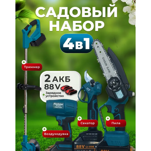 Садовой секатор аккумуляторный/Пила цепная/Набор садовых инструментов 4 в 1/Лазурный