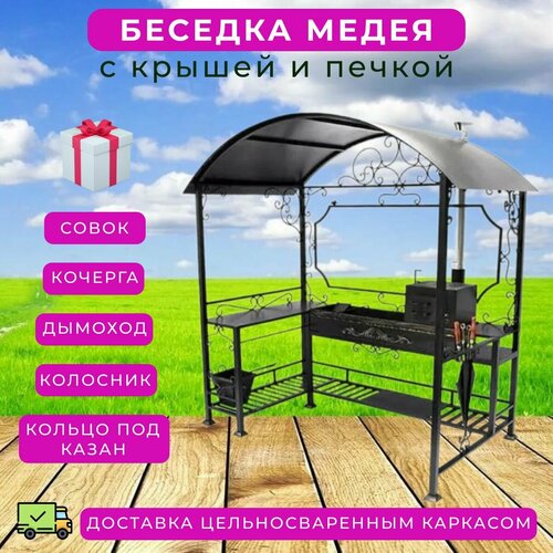 Мангал беседка "Медея" с крышей для дачи и отдыха на природе, кованый уличный навес из стали 3 мм, с жаровней для шашлыка, печью под казан с дымоходом, стационарный, высокий, мангальная зона