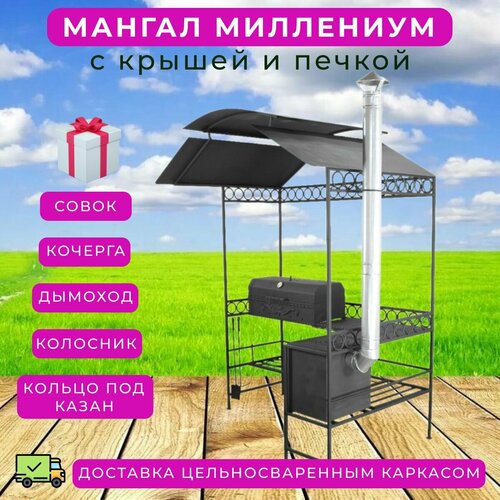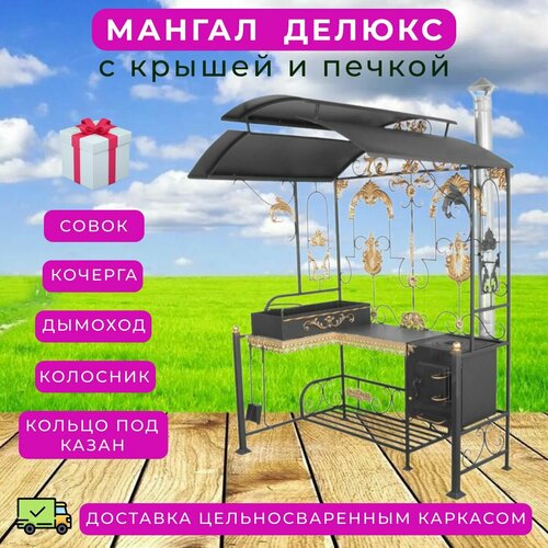 Цены на Мангал "Элит Б" с крышей и печкой c дымоходом, для дачи, кованый уличный навес для отдыха на природе из стали 3 мм, стационарный, высокий, каркасный черный, black в г. Воронеж