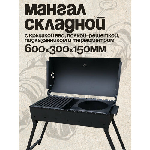 Мангал складной 600мм с полкой-решёткой гриль и подказанником, с крышкой BBQ и термометром, сталь 3мм