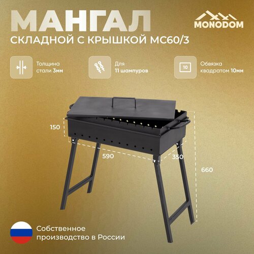 Мангал складной дачный 60см с крышкой, сталь 3мм, на 11 шампуров, чаша шириной 35см, глубина чаши 15см, высота мангала на ножках 66см, для дачи и пикника