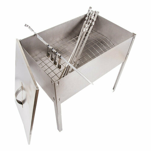 серебристыйМангал-коптильня "эконом" сборная с шестью угловыми шампурами в наборе (410*10*0,8мм). Размер: 400*250*400мм.