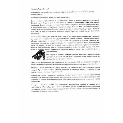 Сетка для садовых качелей включает в себя верхний тент и пришитую к нему москитную сетку. Верхний тент вставляется через металлические дуги (длинные), короткие дуги фиксируются подвязками и карманами по углам тента. В передней части предусмотрены две молнии с перекидным бегунком для удобства использования. Передняя часть москитной сетки сворачивается под крышу и фиксируется карабинами.