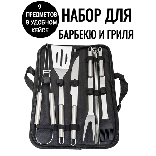 Набор для барбекю 9 предметов с чехлом BBQ / Инструменты для гриля, мангала 9 шт. из нержавеющей стали/ Подарочный набор для шашлыка в кейсе
