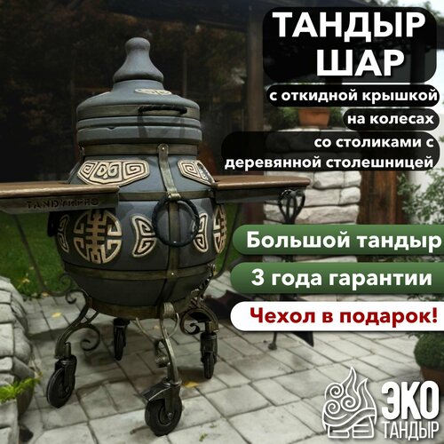 Тандыр ЭкоТандыр Шар с откидной крышкой, с двумя столиками с деревянной столешницей и на колесах, цвет графит / большой тандыр для дачи