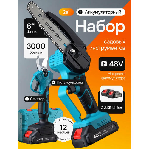 Набор 2 в 1: цепная пила аккумуляторная, секатор, кейс 2 аккумулятора
