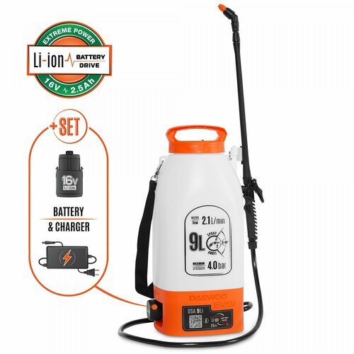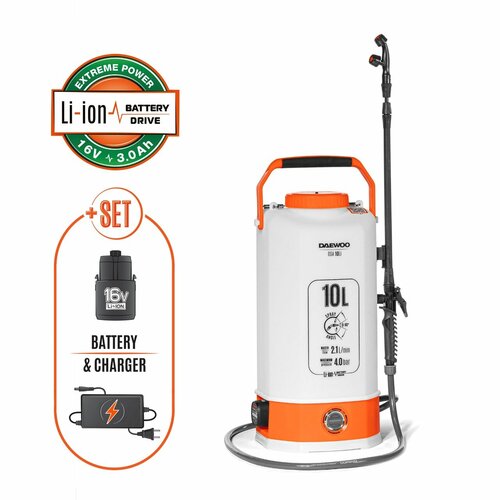 Опрыскиватель садовый DAEWOO DSA 10 Li (10л, 4бар, 2,1л/мин, акк.16В, Li-Ion, 3,0Ач, насадки, 3.0кг)
