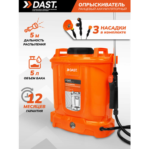 Опрыскиватель аккумуляторный садовый ранцевый DAST 5 л, 12 В, 3 насадки, Li-ion, регулятор скорости, DORA-5L-12VLi