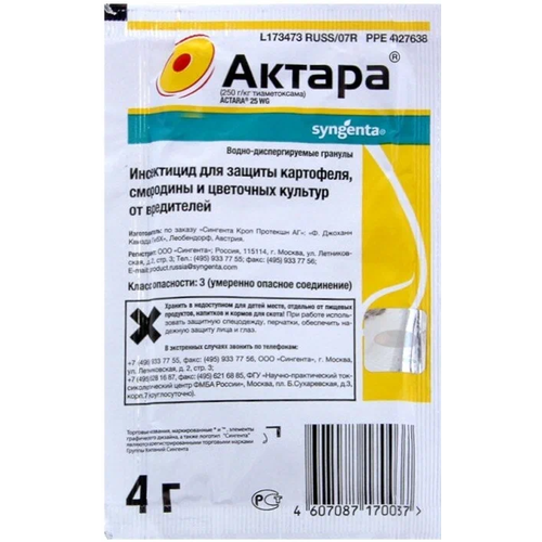 Пестицид Актара ВДГ 250г/кг тиаметоксама 4г относится к третьему классу опасности пестицидов и агрохимикатов, что делает его безопасным для использования на различных культурах.