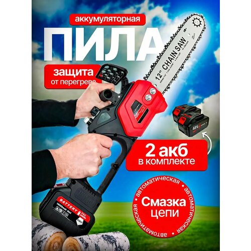 Цепная пила, 12", 6000 мАч, нескользящая рукоятка, , 2 аккумулятора