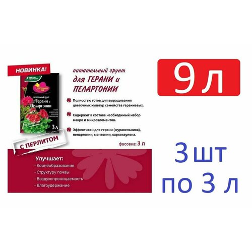 Грунт питательный "Цветочный рай" для герани и пеларгонии с перлитом 9 л (3 шт по 3 л)