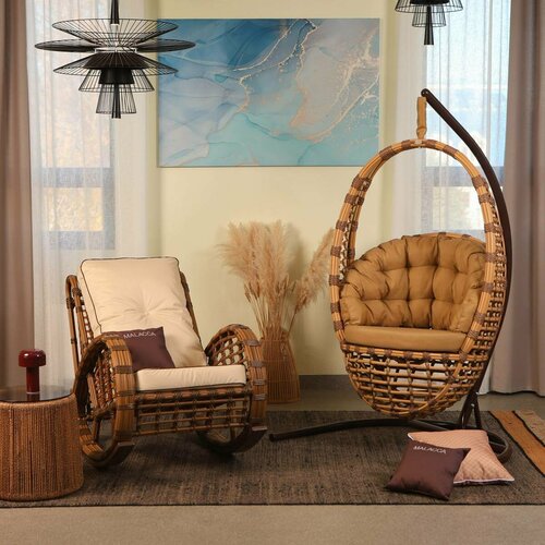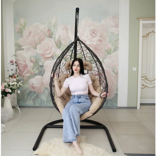Подвесное кресло, Качели подвесные, Качели гнездо для сада, дачи, (Ш950хГ750хВ2000 мм), Касабланка MALACCA кокон коричнево-бежевый (бежевая подушка)