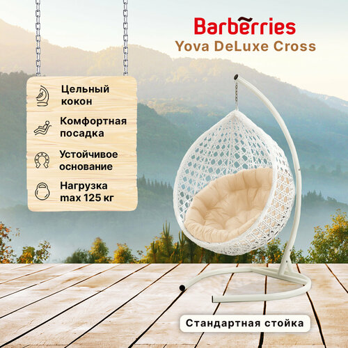 Подвесное кресло кокон садовое Barberries Yova DeLuxe Cross. Стойка белая до 125 кг, подушка круглая бежевая