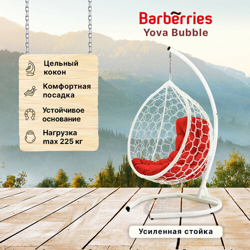 Подвесное кресло кокон садовое Yova Bubble. Стойка белая до 225 кг, подушка трапеция красная