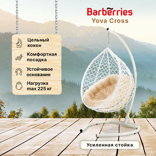Подвесное кресло кокон садовое Barberries Yova Cross. Стойка белая до 225 кг, подушка круглая бежевая