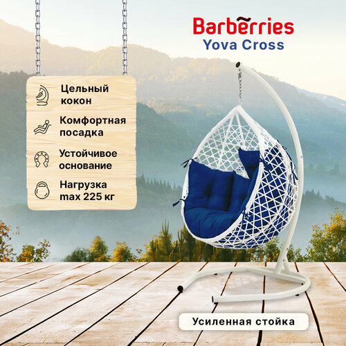 Подвесное кресло кокон садовое Barberries Yova Cross. Стойка белая до 225 кг, подушка комфорт синяя