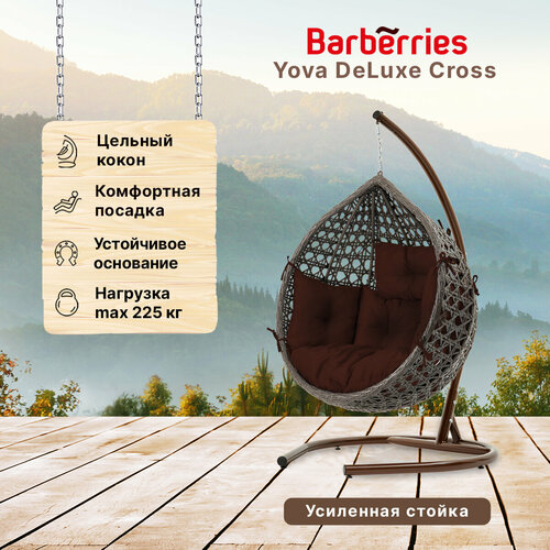 Подвесное кресло кокон садовое Barberries Yova DeLuxe Cross. Стойка венге до 225 кг, подушка комфорт коричневая