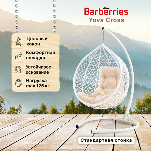 Подвесное кресло кокон садовое Barberries Yova Cross. Стойка белая до 125 кг, подушка трапеция бежевая