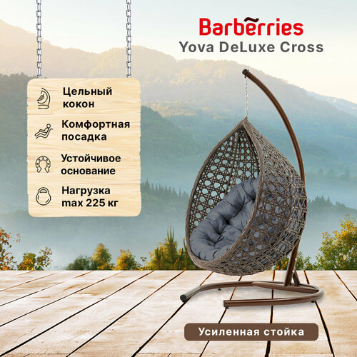 Подвесное кресло кокон садовое Barberries Yova DeLuxe Cross. Стойка венге до 225 кг, подушка круглая серая