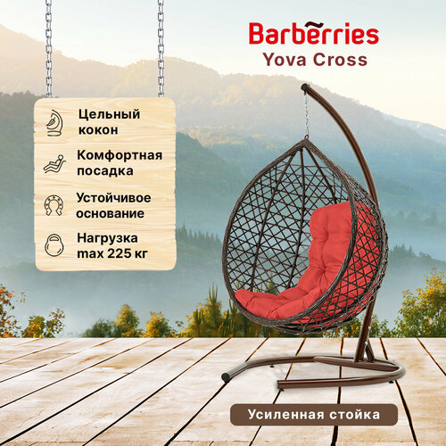 Подвесное кресло кокон садовое Barberries Yova Cross. Стойка венге до 225 кг, подушка трапеция красная