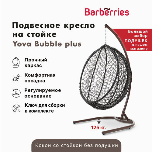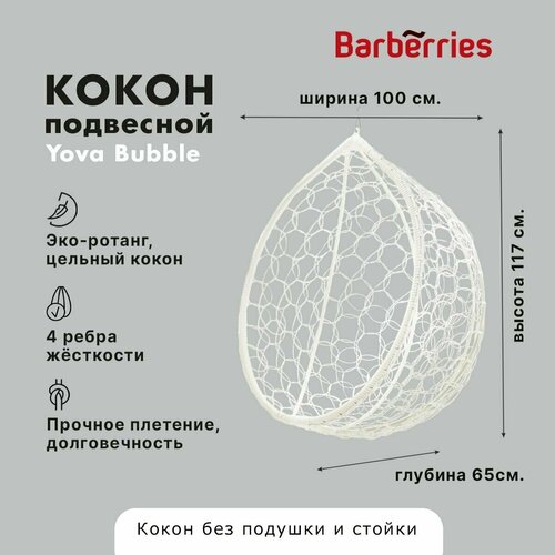 черный, белыйПодвесное кресло Yova Bubble от бренда Barberries станет прекрасным дополнением к интерьеру вашей квартиры, загородного дома, садового участка, балкона, веранды или террасы. Особенность нашей компании в том, что мы не закупаем продукцию за рубежом, а являемся производителями и все комплектующие изготавливаем на собственном производстве, что позволяет контролировать качество продукции. - Кресло-Кокон: Изготовлено само подвесное кресло из искусственного ротанга. Эко-ротанг – это легкий и одновременно прочный материал, устойчивый к ультрафиолетовому излучению, имеет уникальную водостойкость и может выдержать температурные перепады -30/+50 Не нуждается в специальном уходе и хранении, что значительно облегчает эксплуатацию. И что не мало важно искусственный ротанг экологически чистый продукт и может быть повторно переработан. Так же кокон имеет 6 рёбер жёсткости, тем самым, не давая плетению ротанга провисать под весом человека и добавляет комфорта при эксплуатации - Стойка: Металлические каркасы нашей мебели