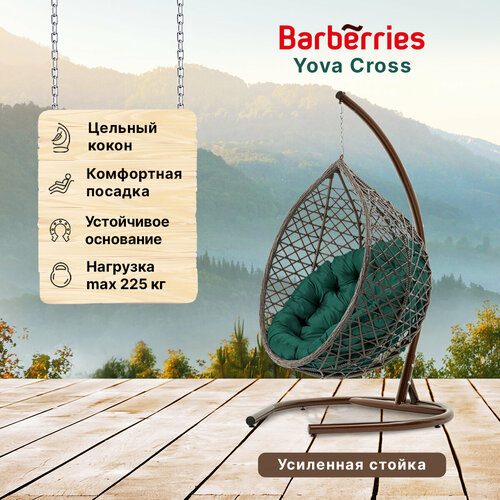 Подвесное кресло кокон садовое Barberries Yova Cross. Стойка венге до 225 кг, подушка круглая зеленая