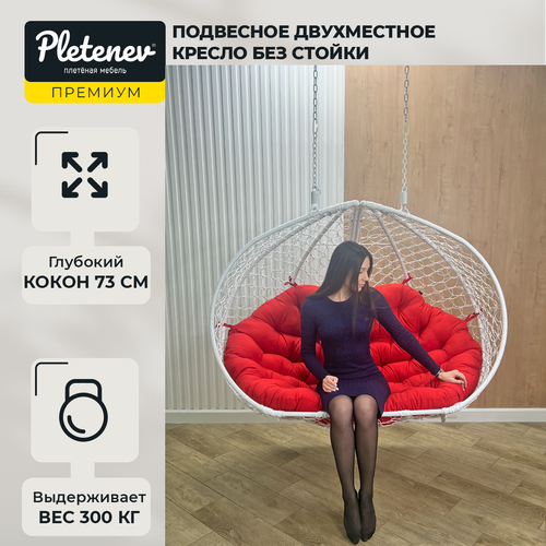 Подвесное садовое двухместное белое кресло без стойки с красной подушкой