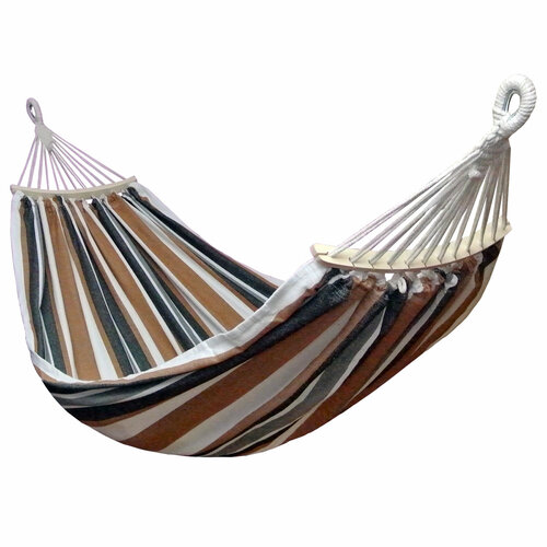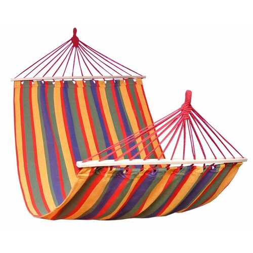 зеленый, фиолетовый, красный, оранжевыйДанный гамак с деревянными перекладинами, имеет полосатую расцветку, и выполнен из приятного на ощупь натурального материала - хлопка. Планки гамака имеют ширину - 100 см, а полотно гамака ширину - 130 см. Планки не дают человеку полностью "утонуть" в гамаке, не заслоняют обзор, а благодаря тому, что ширина полотна чуть больше ширины планок, гамак не так сильно подвержен переворачиванию. Гамак сделан из плотной и прочной хлопковой ткани с небольшим добавлением полиэстра. Такая ткань обеспечивает надёжность в эксплуатации, выдерживая до 135 кг нагрузки. Гамак можно подвешивать на стволы деревьев, но при необходимости могут подойти и другие надёжные опоры (столбы, кронштейны в стене, специальные подставки и т.д.). Ширина в 130 см, для одного человека будет наиболее комфортной, особенно если этот человек имеет крупное телосложение. Также в гамаке можно разместиться с ребёнком. Гамаки из хлопка рекомендуется использовать, по возможности, в тени, чтобы дольше сохранить яркую расцветку ткани, и заодно поберечь себя