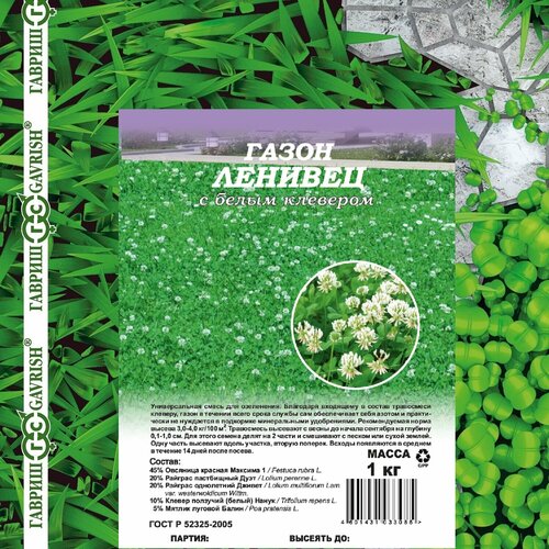 Семена Гавриш "Газон Ленивец", с белым клевером, 1 кг, многолетние, газонная травосмесь