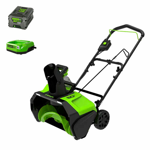 Снегоуборщик аккумуляторный Greenworks GD60PSTK4II 60V, комплект 2 АКБ 4 Ач +быстрое ЗУ GD40STK4II