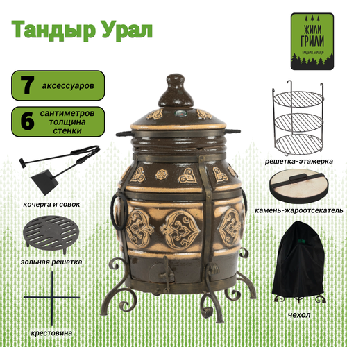 Ручки Тамерлана обтянуты в натуральную кожу, на крышке тандыра установлен удобный термометр для контроля температуры, а в комплектацию включены 10 шампуров с удобными зажимами, камень-жароотсекатель, чехол и кованные кочерга с совком.