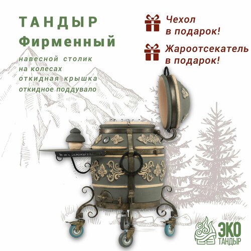 Тандыр ЭкоТандыр Уфа, откидная крышка, с 2-мя столиками, на колесах / чехол, сборник рецептов в подарок