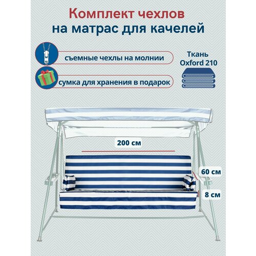 Чехол съемный на матрас для садовых качелей, непромокаемый комплект сиденье+спинка, 200x60х8 см, сине-белый