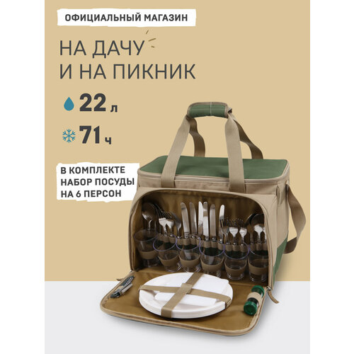 Набор для пикника с посудой на 6 персон и термосумкой Арктика 4100-6 бежевый/зеленый 22 литра сумка-холодильник 33 предмета в комплекте