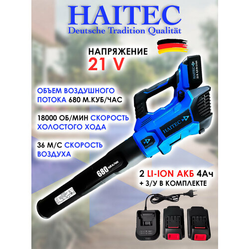 Воздуходувка аккумуляторная HAITEC HT-ALB680/4, 2 Li-ion аккумулятора + з/у 21 В, скорость воздуха 36м/с