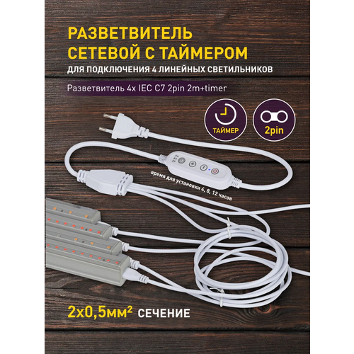Разветвитель сетевой для линейных светильников ЭРА Разветвитель 4х IEC C7 2pin 2m+timer на 4 точки с таймером 4, 8, 12H