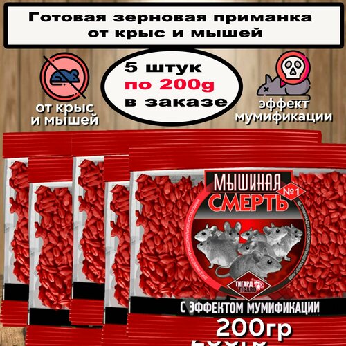 "Мышиная смерть №1" отрава, приманка против крыс и мышей, зерновая с эффектом мумификации 200гр.'тигард' 5шт. по 200гр.
