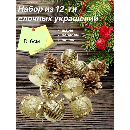 Набор елочных украшений (шары, барабаны, шишки), 12 шт.