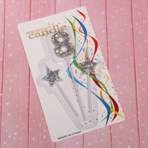 Свеча для торта Цифра Звёздное сияние "8" 16 см (набор 3шт), серебро