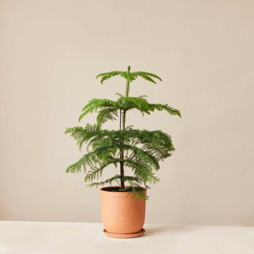 зеленыйСтильное пушистое хвойное вечнозеленое растение. Относится к редким хвойным деревьям, которые можно выращивать в домашних условиях. Характеризуется мягкой хвоей игольчатой формы светло-зеленой окраски, длина одной пластинки около 1-2 см. Ветви растения располагаются горизонтальными рядами, ствол прямой высокий и мощный. При комнатном разведении араукария может прожить до 10 лет, достигает высоты до 2 метров, показывая ежегодный прирост в среднем около 20 см. Не цветет, образует шаровидные плоды, похожие на орехи. Помимо декоративных качеств, ценится за способность очищения воздуха от микробов и токсинов, является природным увлажнителем воздуха. Растение отлично развиваеися при ярком рассеянном свете и высокой влажности воздуха. Станет прекрасным украшениеем интерьера, простая в уходе, не требует особых условий содержания и подойдет даже начинающим цветоводам. Растение доставляется в глиняном брендированном горшке терракотового оттенка и требует последующей пересадки в емкость большего размера, в специализиров