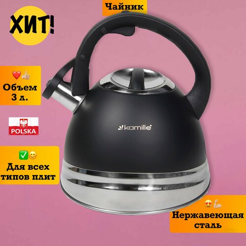Чайник 2,7 л. из нержавеющей стали со свистком Kamille KM-1092 (2,7 л. /) черный