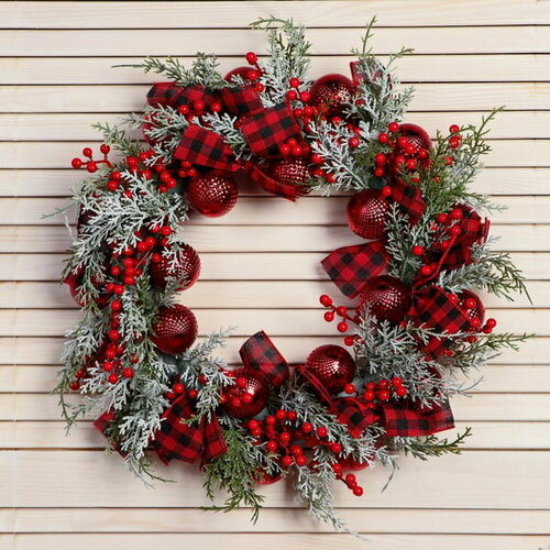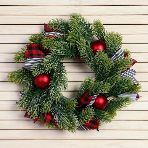 Венок новогодний d- 36 см "Уютная сказка" клетчатые ленты алые шары
