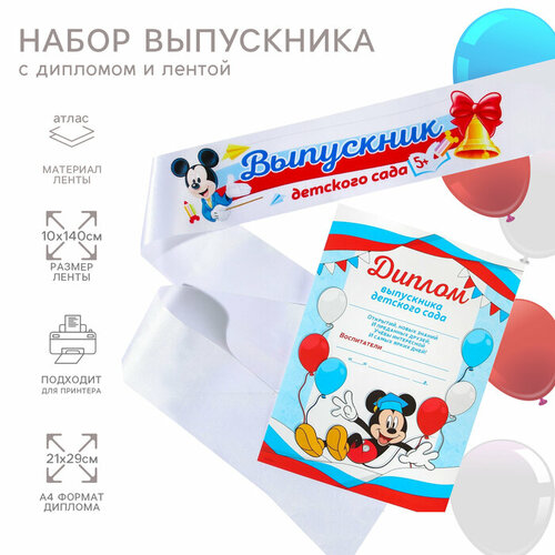 Набор на выпускной "Выпускник детского сада", лента и диплом, Микки Маус